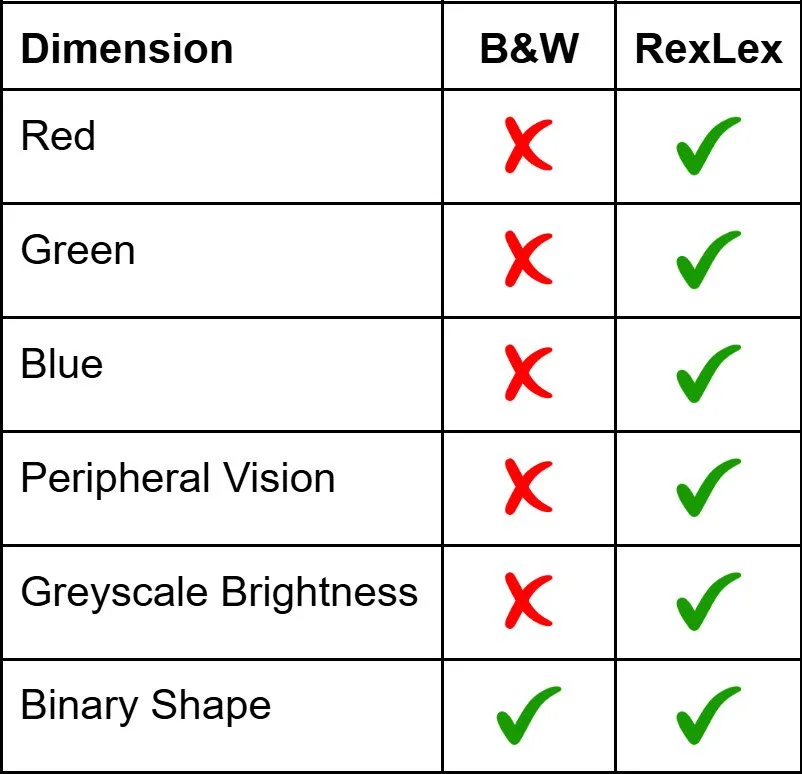 RexLex enables the brain to utilize additional, previously untapped, categories of measurements, compared to standard Black & White (B&W) text: