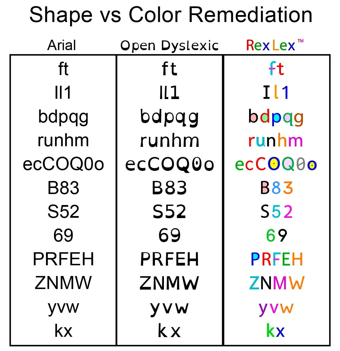 RexLex is clearly the most distinct typeface engineered for dyslexics. It taps unused dimensions: Red, Green, Blue & Variable Brightness. Additionally, peripheral vision, which does not meaningfully decode shape, can decode color, providing an extra set of optical measurements to both cross reference memories and guide the focal point.