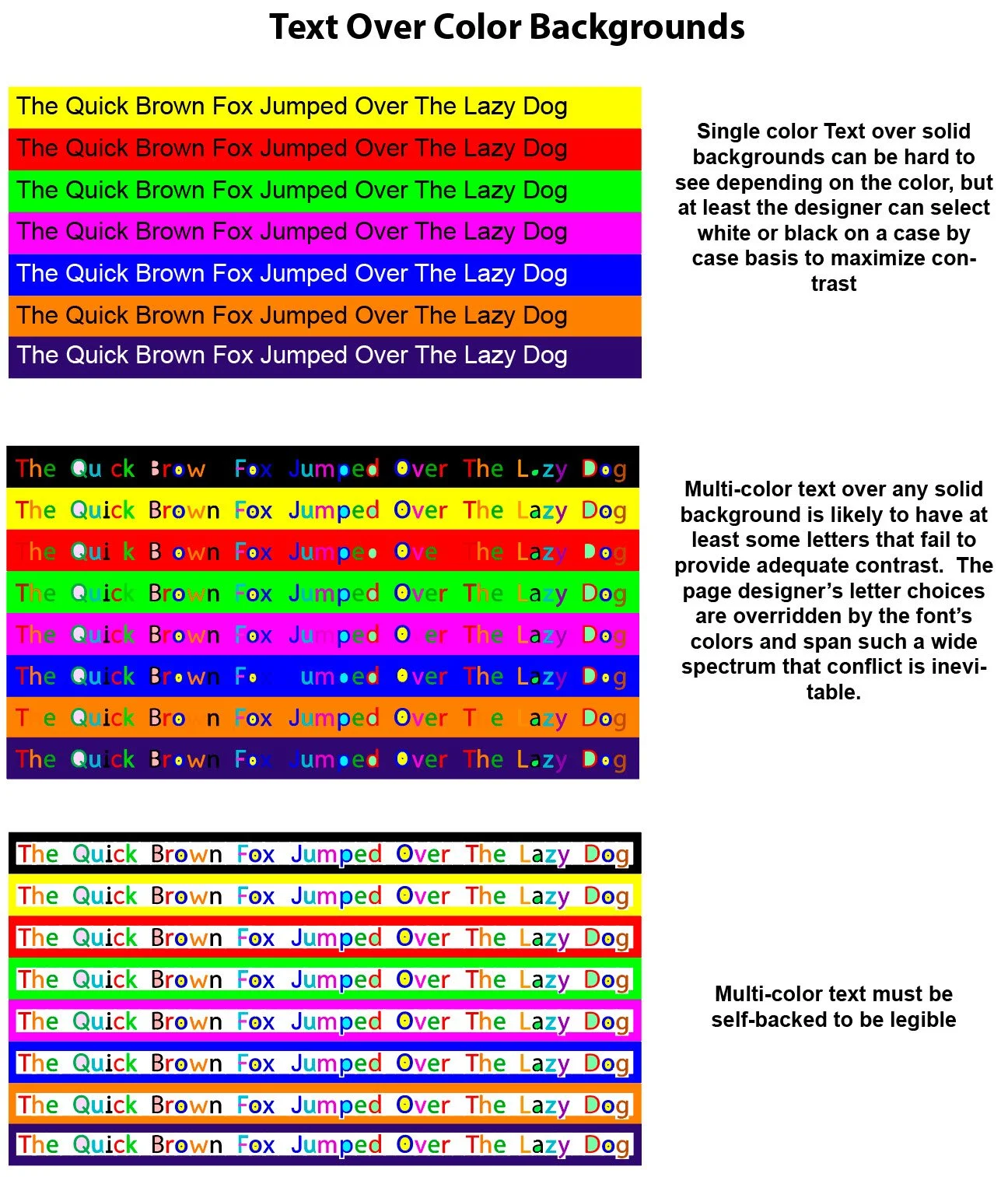 Diagram illustrating text over color backgrounds and multi-color text options, demonstrating contrast and legibility challenges. RexLex implements the same solution as many closed captioning TV systems. Letters contain their own white backing.